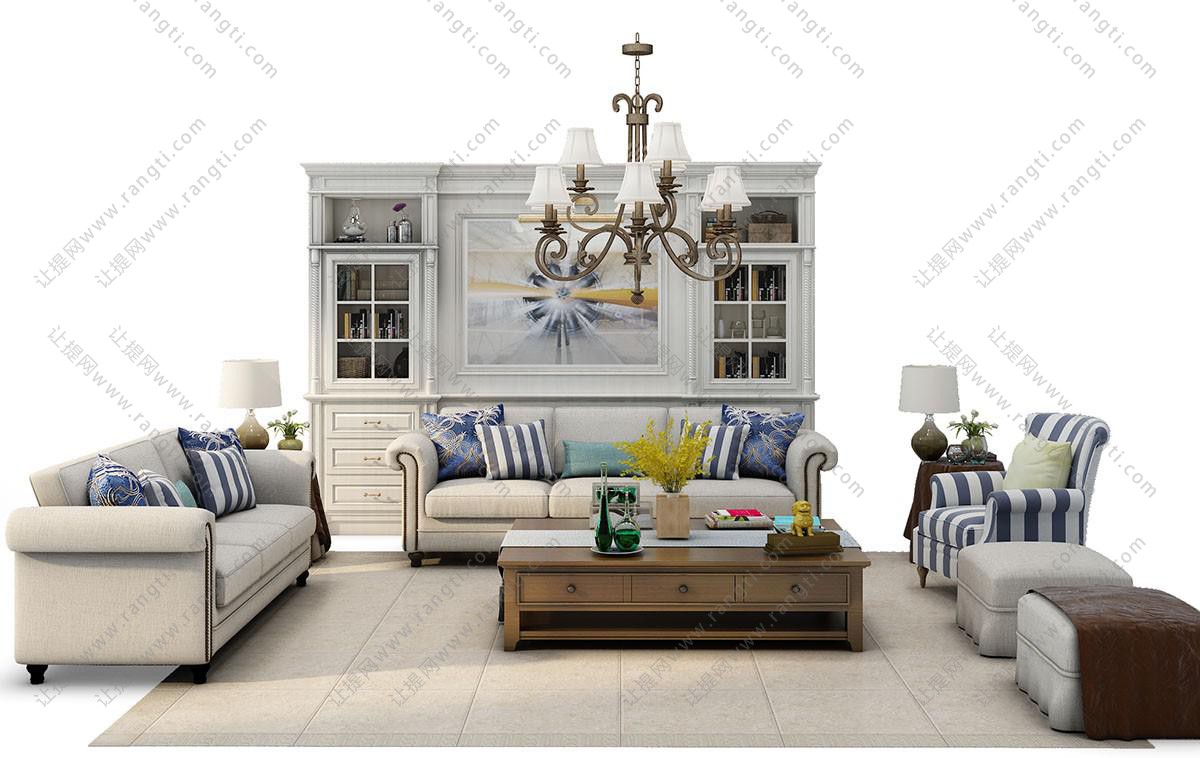 简欧多人沙发、双人沙发、实木茶几和吊灯组合3d模型