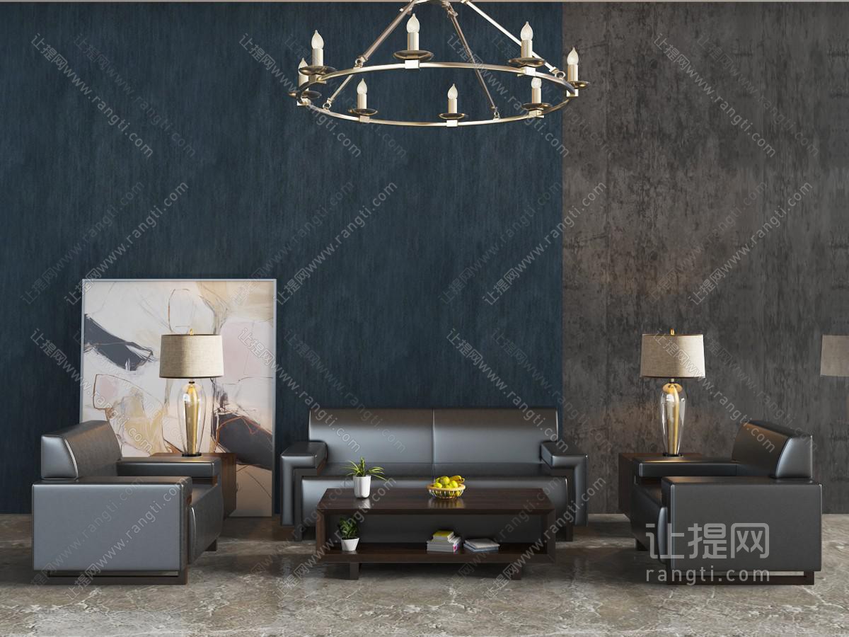 现代黑色皮革多人沙发、单人沙发和茶几组合3d模型