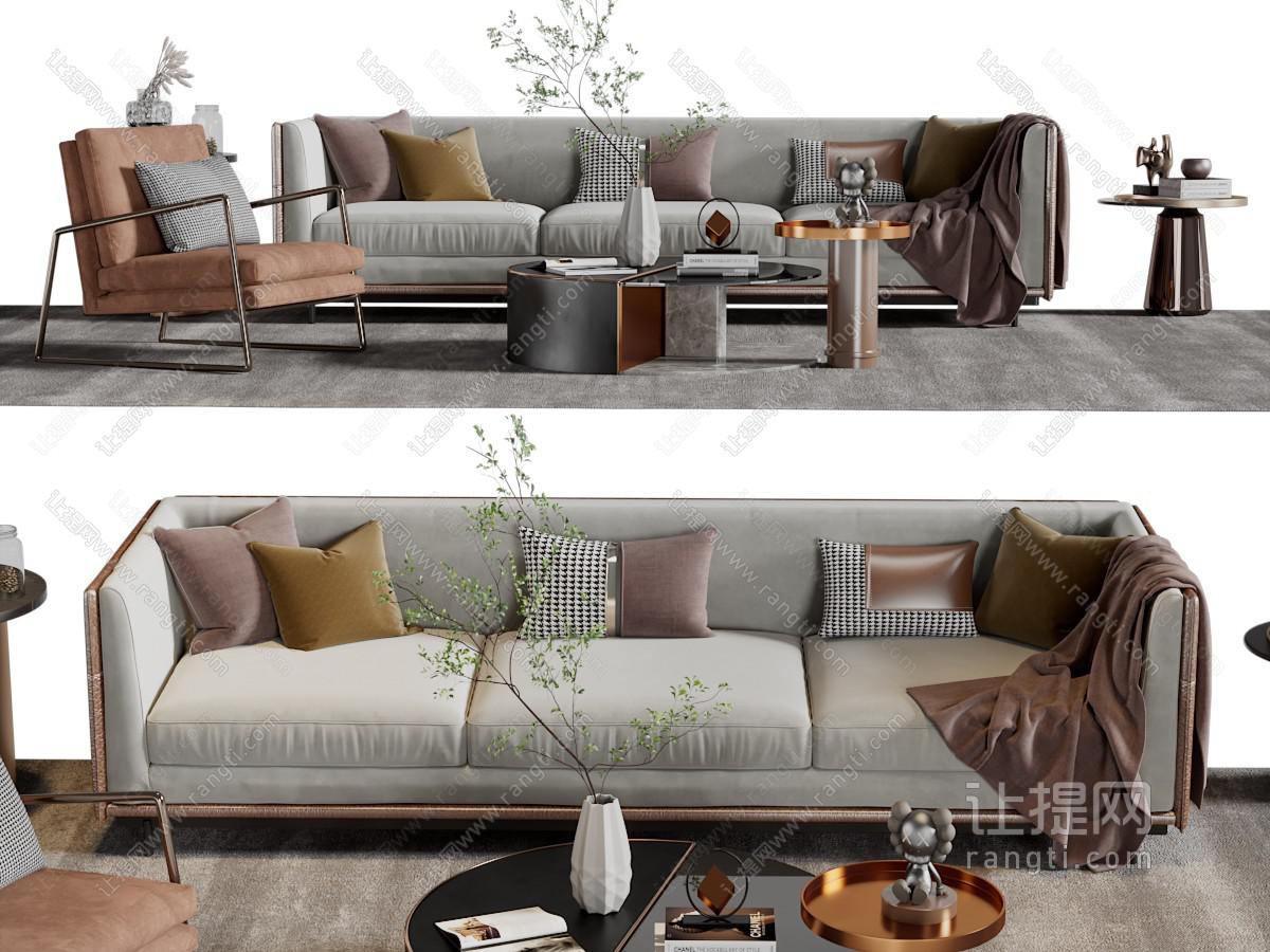 现代多人沙发、休闲椅子和茶几组合3d模型
