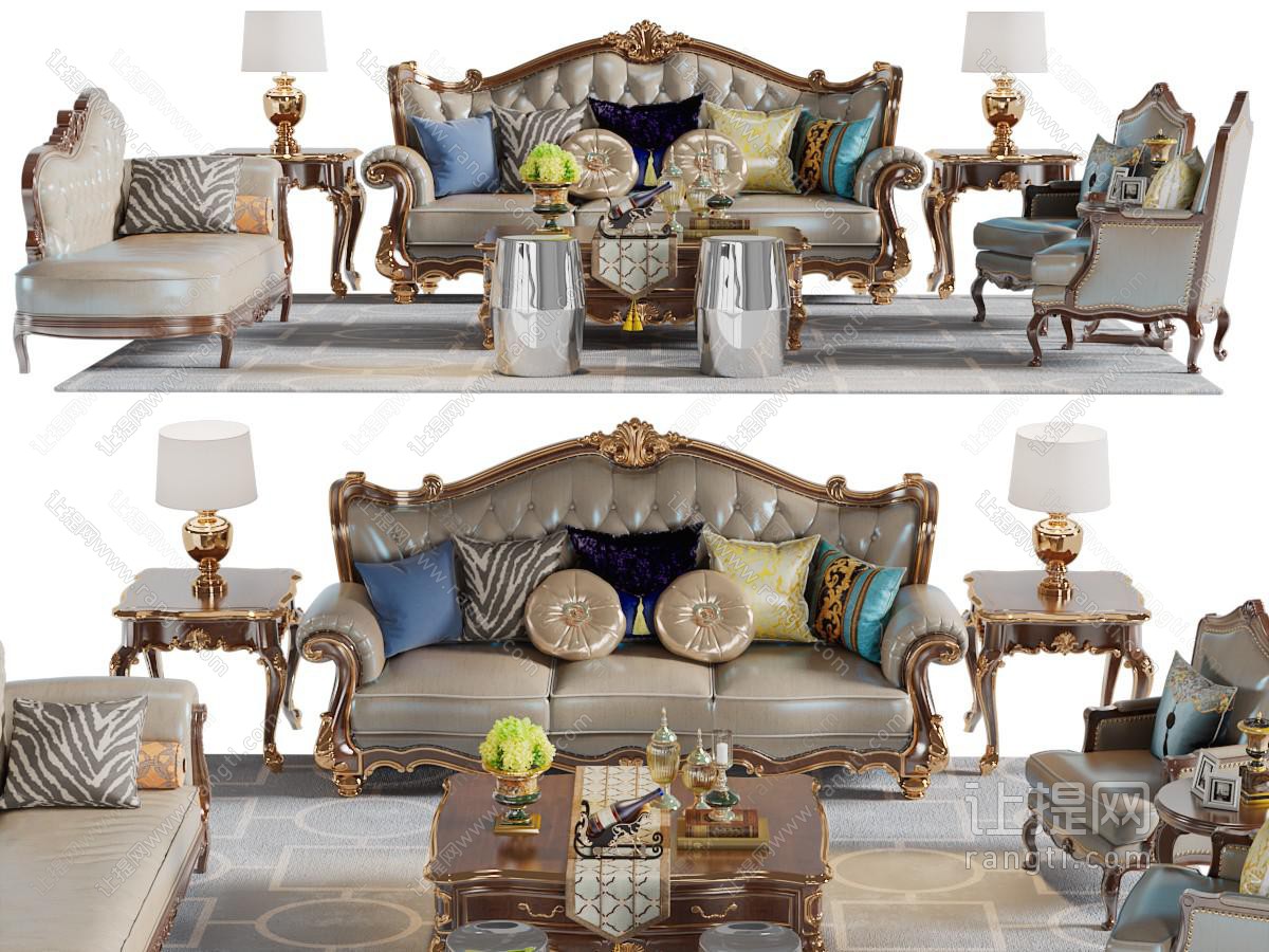 欧式雕花多人沙发、贵妃椅和茶几组合3d模型